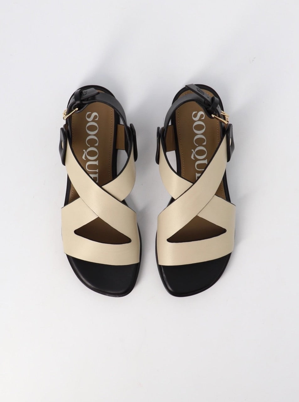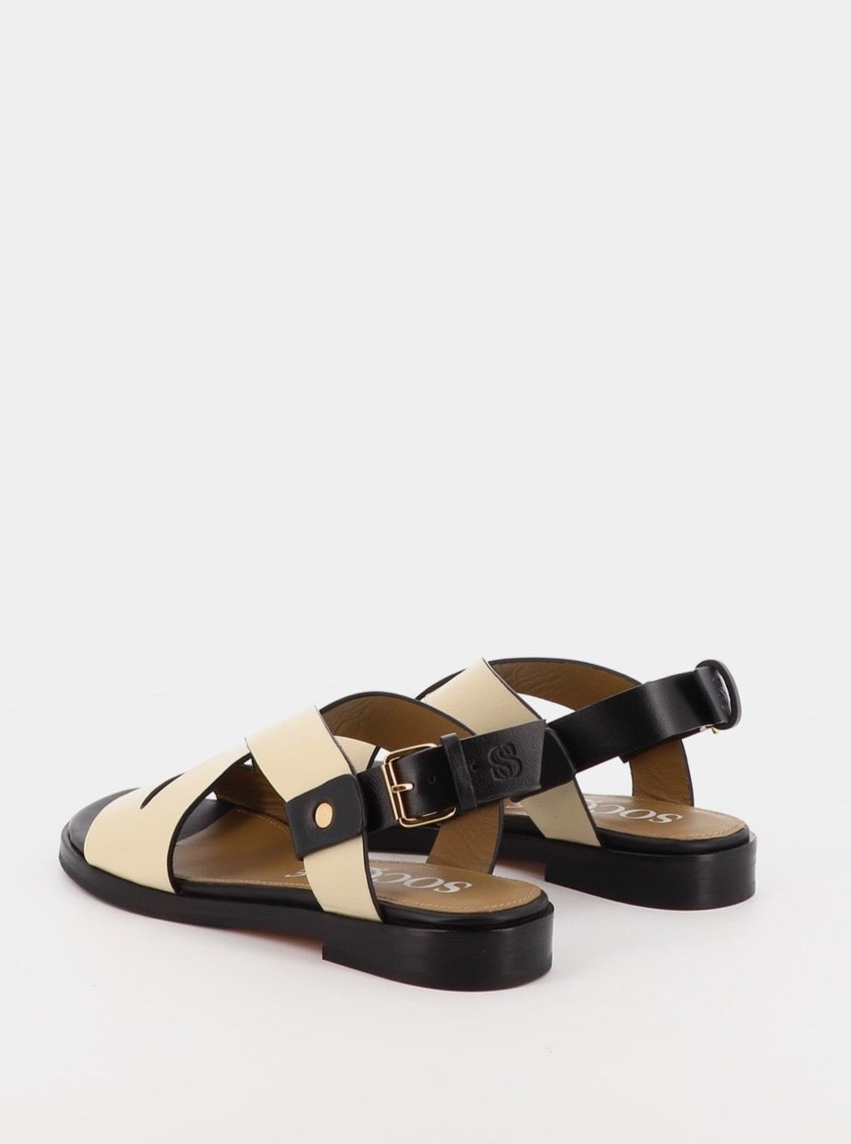 Sandale plate à brides en cuir de veau crème & noir. Talon : 2 cm.