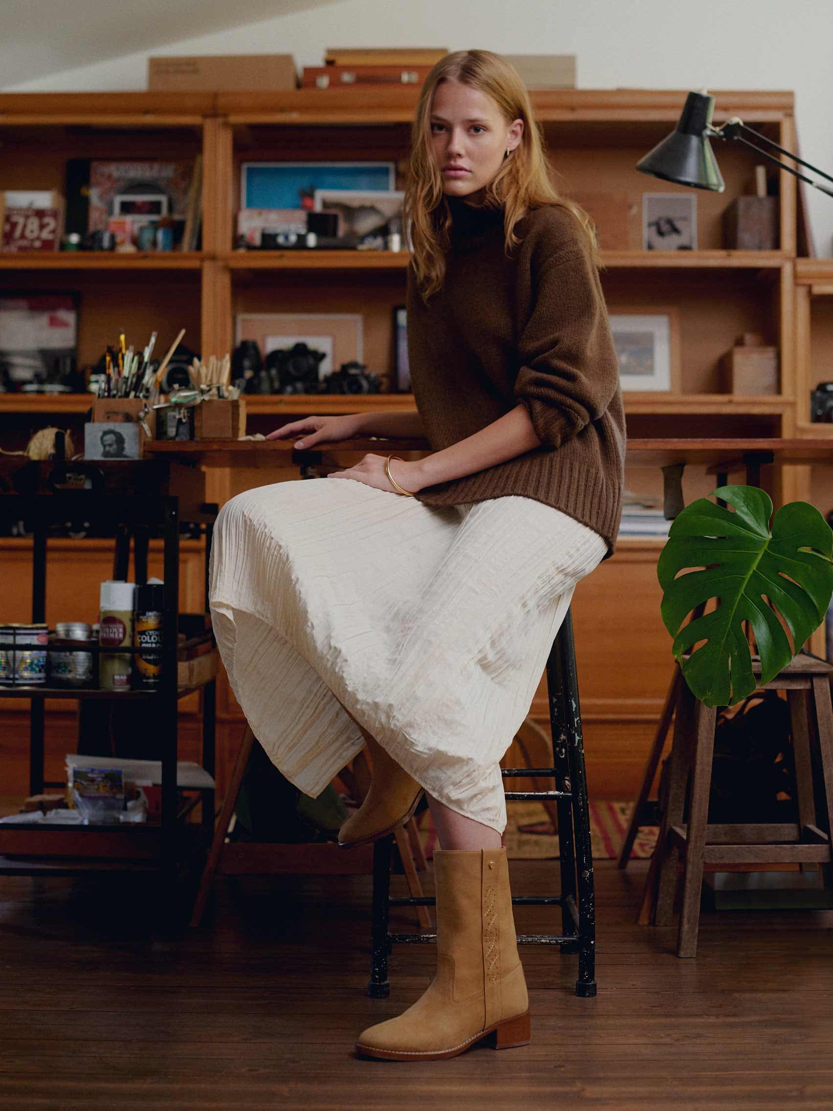 Une bottine sobre et élégante, aux faux airs de camarguaise. Ses lignes droites, rehaussées de découpes sellier et adoucies par la rondeur de son bout, lui donnent une allure affirmée. Un subtil jeu de découpes et de surpiqûres orne sa tige. Elle se porte aussi bien sur un jean qu’avec une robe fluide.