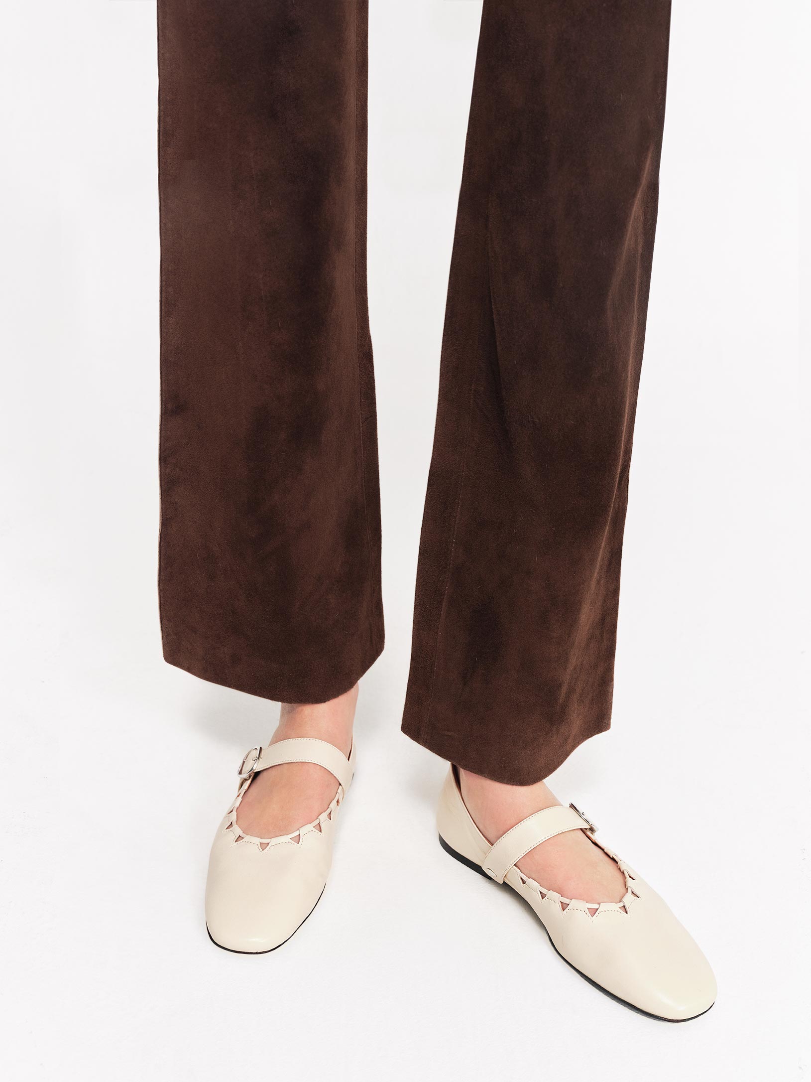 Une ballerine plate, à la fois simple et sophistiquée. Son jeu de découpe lui apporte une touche de romantisme et est rehaussé par le contraste de sa boucle métallique. Confectionnée dans des cuirs très souples et dotée d'une semelle moussée, Ginger est un parfait allié du quotidien.