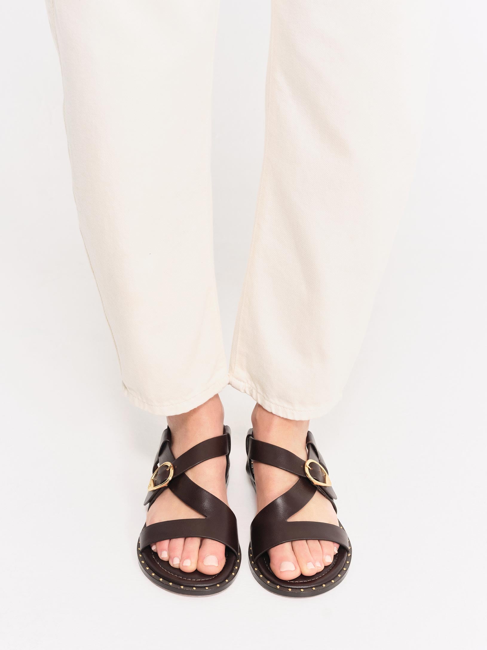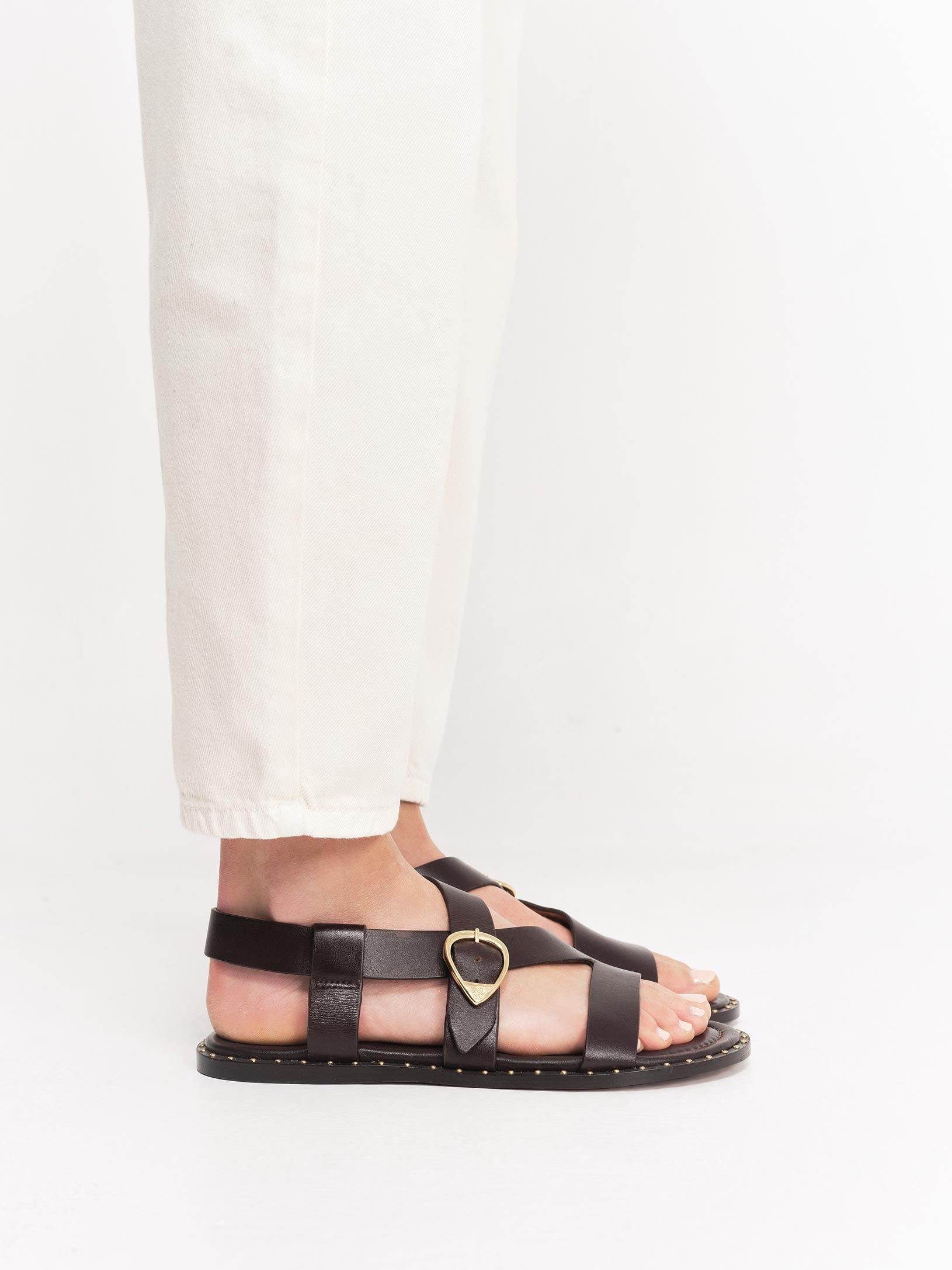 Une sandale au design épuré, soulignée par une teinture bord franc et une ligne de studs métalliques qui ponctuent la semelle. Ses brides larges enveloppent le pied avec élégance tout en assurant un confort optimal. Un essentiel du vestiaire estival.