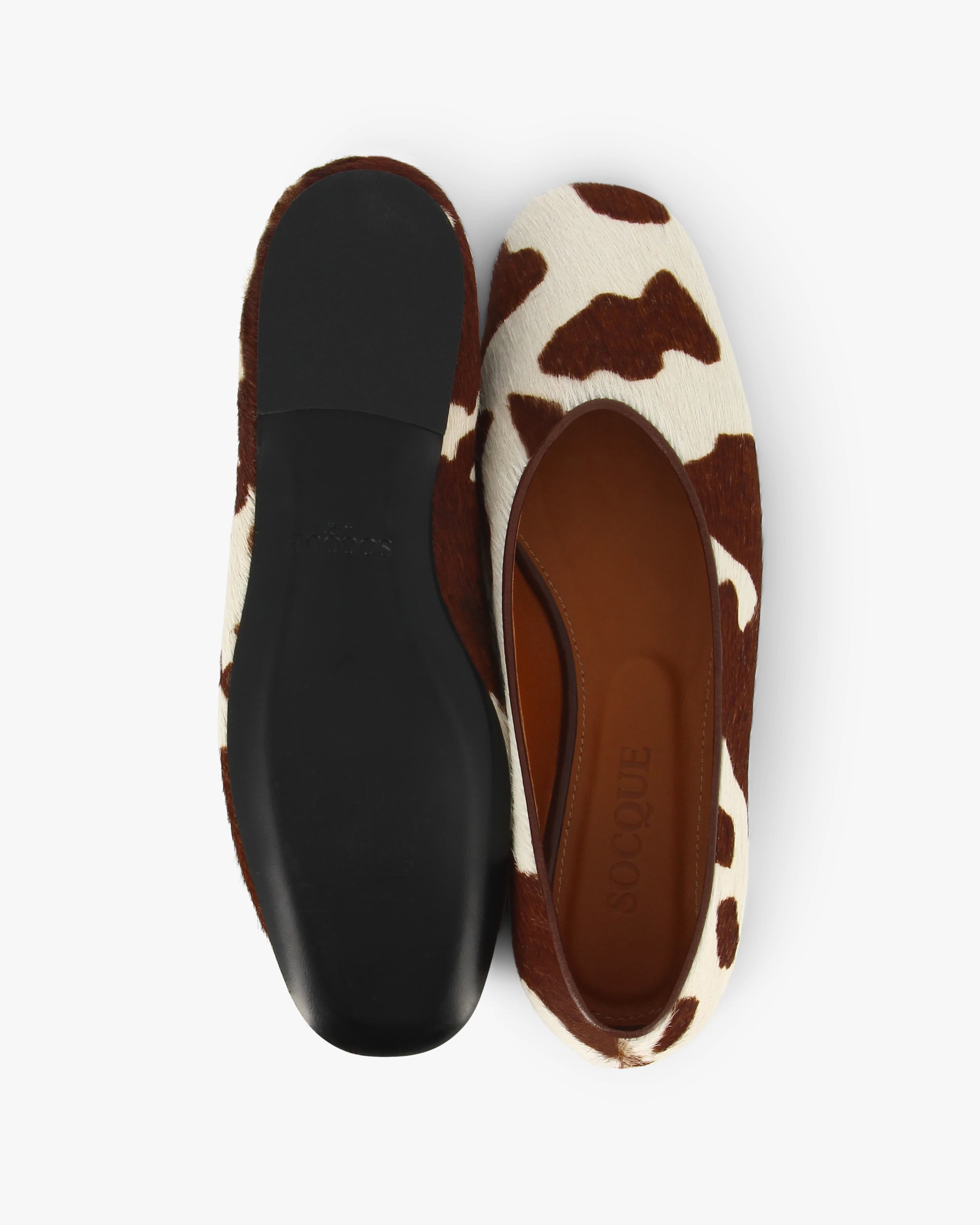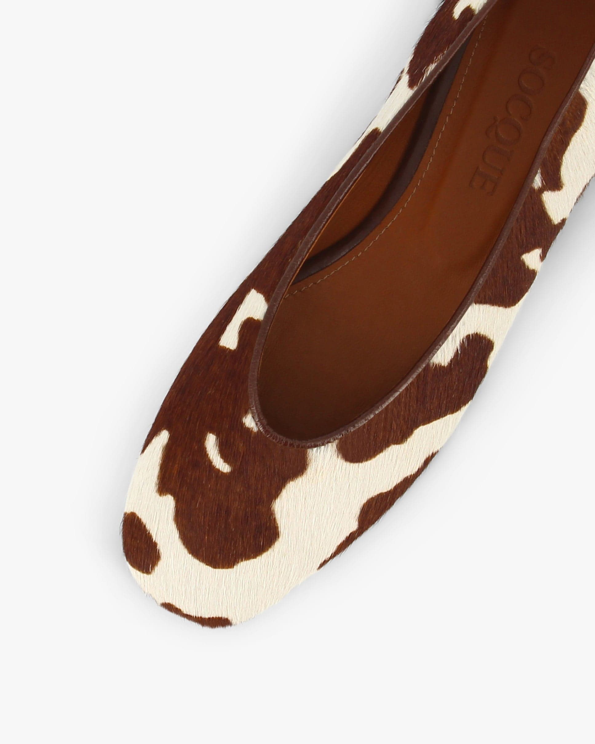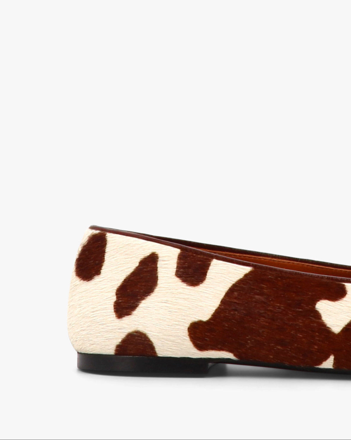 Une ballerine au design épuré, rehaussée d’un piping contrasté qui souligne son décolleté. Confectionnée dans un cuir imprimé façon vache, elle dessine une silhouette affirmée, à l’allure subtilement cowboy. Un parfait allié du quotidien.